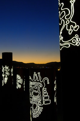 somewhere around 9 o’clock on the esplanade I think…hollow, light filled columns highlighting original glyph designs that looked at least in part, mayan inspired.