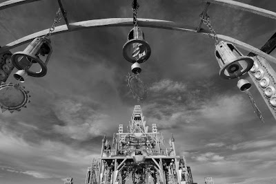 The Temple of 2008 was a beautiful monument to waste. Basura Sagrada was, like all it’s predecessors, essentially more popular than the Man itself. Sunday’s burn is for many the most anticipated event. This is mainly because it is is full of humanities blood sweat and tears. Not through it’s construction but through the pain and love and suffering expressed by visitors and left as a spiritual statement, an absolution, an apology, a plea for intercession, thanks, love or some emotional sentiment to be delivered by conflagrant updraft. This year the crafty constructors got to design and build their own viewing seats around the perimeter. This shot includes the decorated arch of one.
