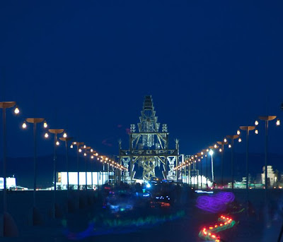 The Temple of 2008 was a beautiful monument to waste. Basura Sagrada was, like all it’s predecessors, essentially more popular than the Man itself. Sunday’s burn is for many the most anticipated event. This is mainly because it is is full of humanities blood sweat and tears. Not through it’s construction but through the pain and love and suffering expressed by visitors and left as a spiritual statement, an absolution, an apology, a plea for intercession, thanks, love or some emotional sentiment to be delivered by conflagrant updraft. This year the crafty constructors got to design and build their own viewing seats around the perimeter. This shot includes the decorated arch of one.